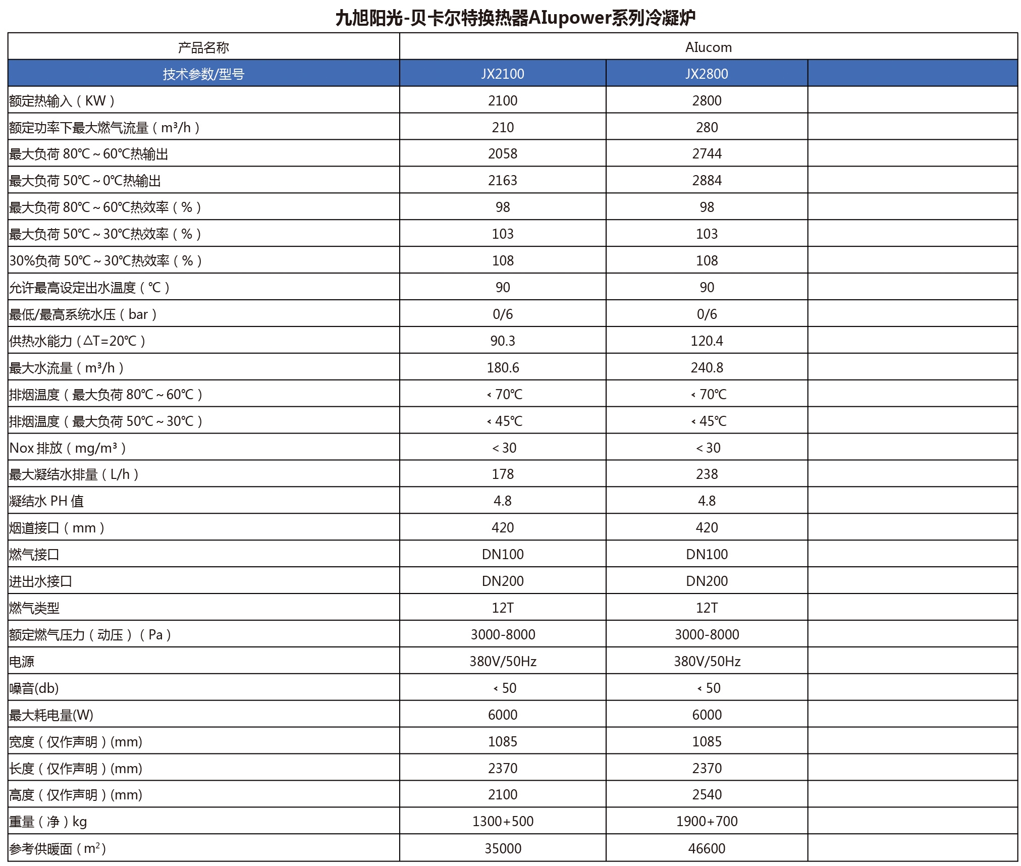 ?采用原裝進口配件,性能優越 ?全預混冷凝技術,空燃比更合理 ?采用貝卡爾特硅鎂鋁合金熱交換器,傳熱效率高, 耐腐蝕性強 ?功率2100KW~2800Kw ?供暖面積35000~46600m2 ?熱效率109% ?節能、高效,比一般鍋爐節能約35%以上 ?環保,Nox排放(綜合平均值)在30mg/m3以下 ?微電腦智能控制,操作便捷